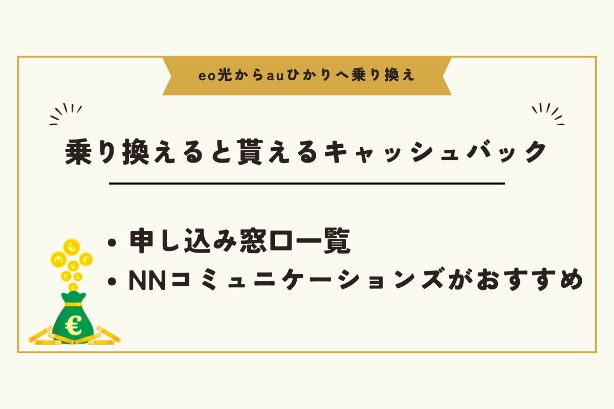 auひかりへの乗り換えを考えている方は、お得にキャッシュバックをもらえるNNコミュニケーションズで申し込みましょう。