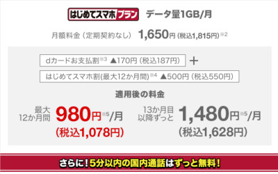 はじめてスマホプランを利用すると、はじめてスマホ割が適用され最初の1年間は月々1,078円でスマホの利用ができます。またプラン契約中は1回あたり5分以内の国内通話が何度でも無料になります。