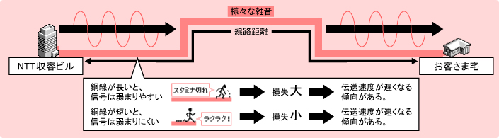 信号が弱まると通信速度が遅くなりやすいです。信号が弱まる現象を「伝送損失」と言い、基地局と自宅の距離が遠くなるほど高くなり通信速度が低下します。