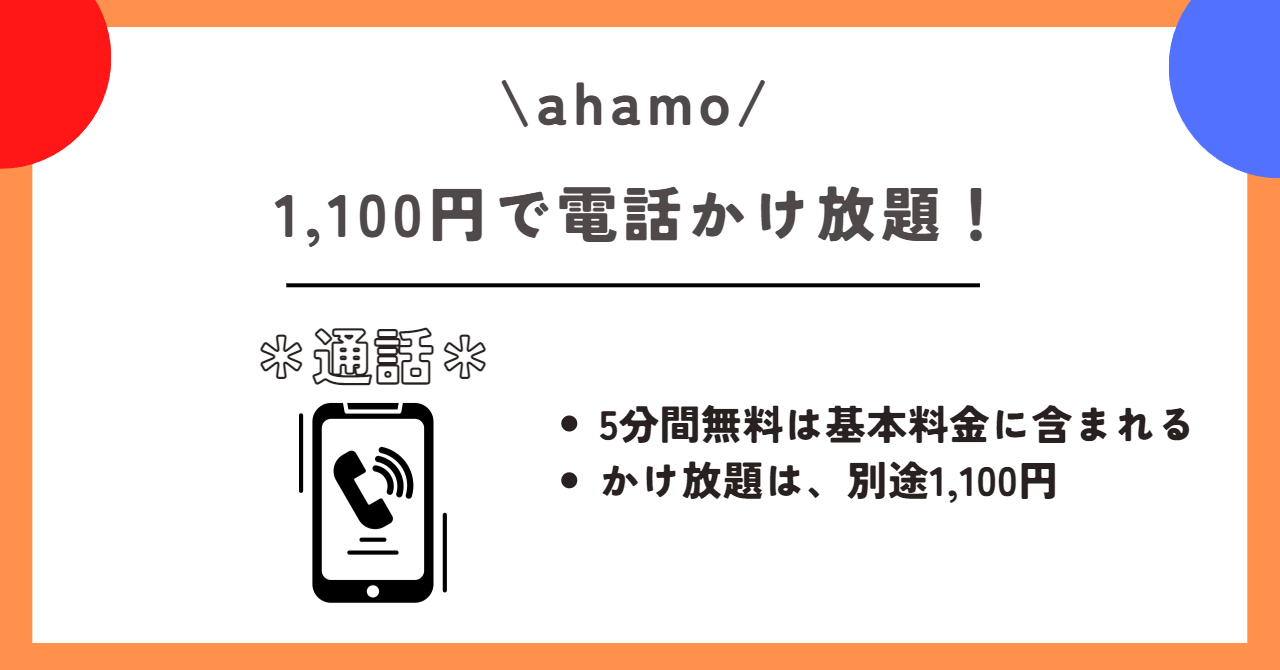 ahamoでは5分以内の国内通話料金は基本料金に含まれていますが、5分以上話した場合は別料金です。5分以上の通がが多い方は、「かけ放題オプション」への加入を検討しましょう。