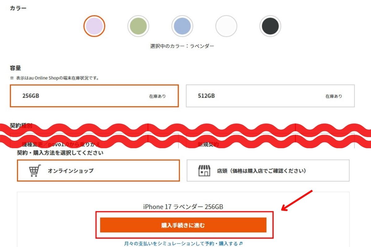 ここでは、auオンラインショップで最新のiPhone17に分割払いで申し込む手順を解説します。