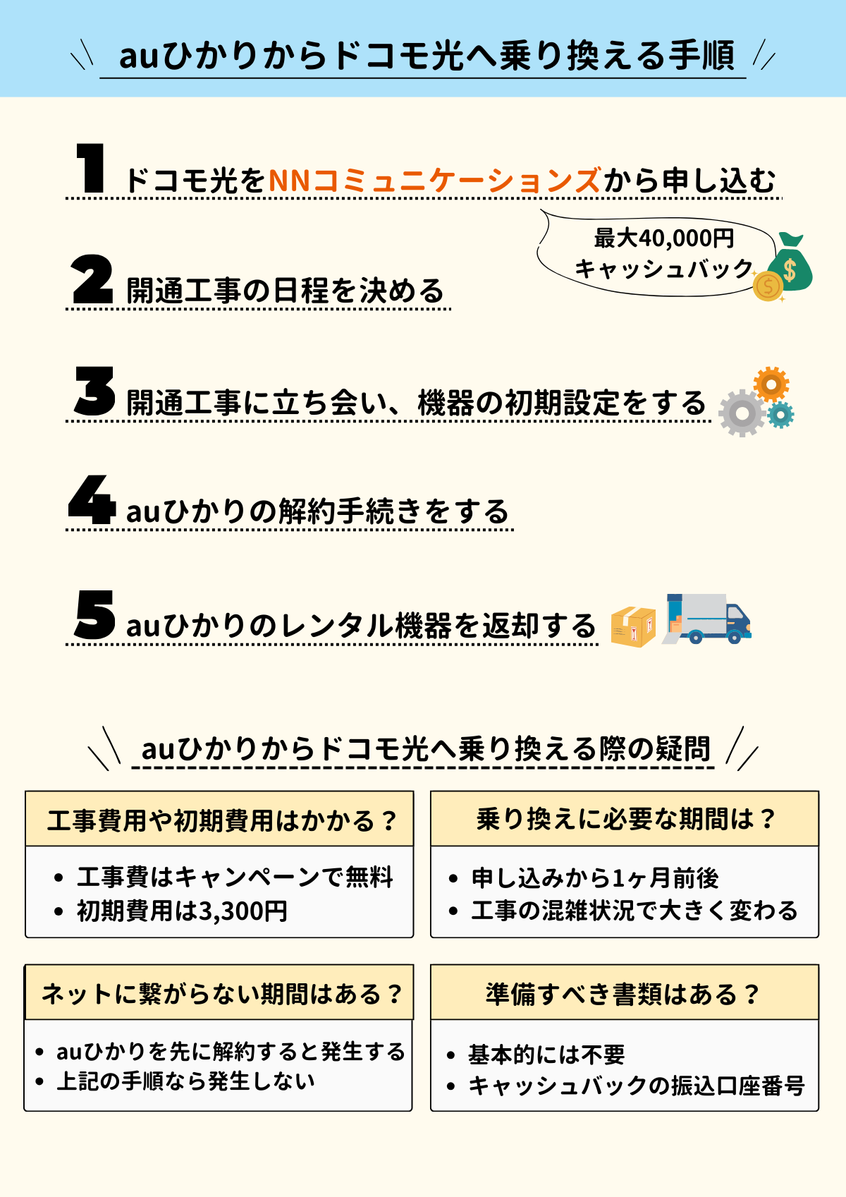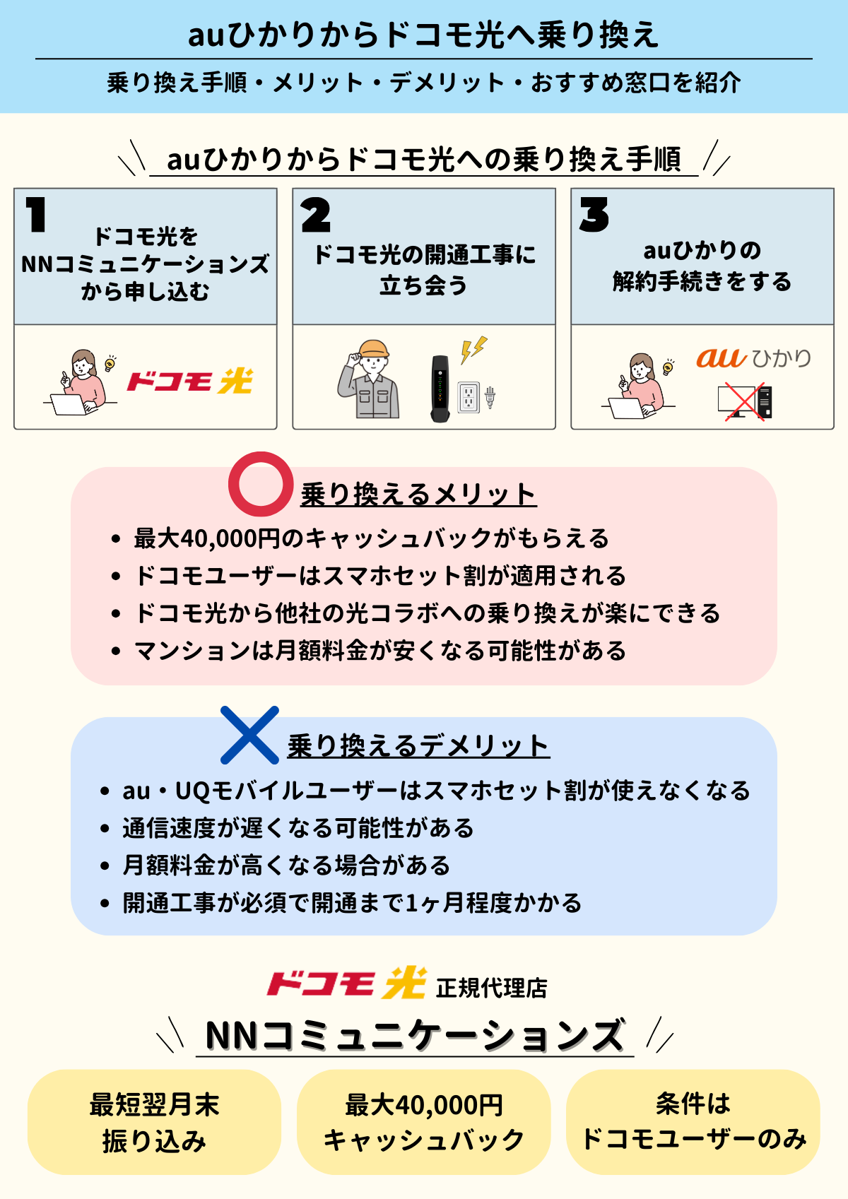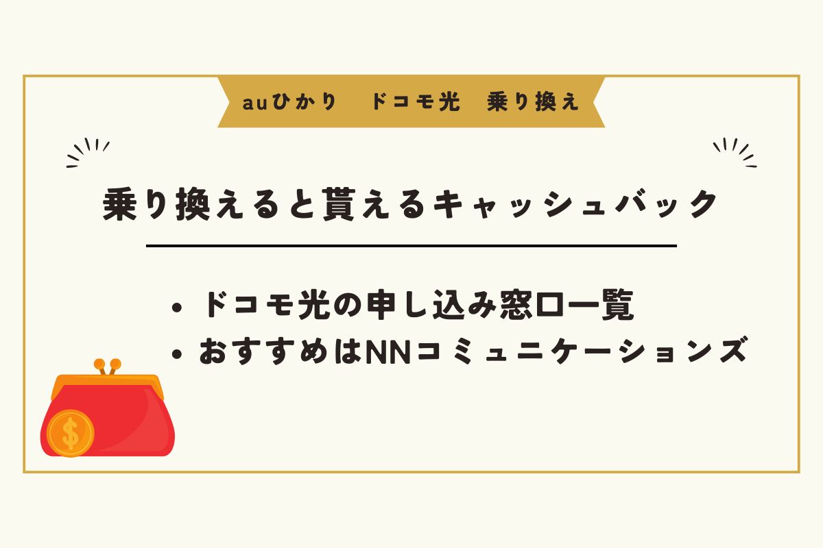 auひかりからドコモ光への乗り換えは、最大40,000円のキャッシュバックがもらえる「NNコミュニケーションズ」がおすすめです。