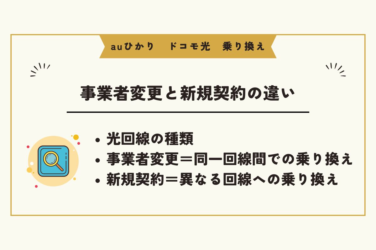 事業者変更は、光コラボから他社の光コラボへの乗り換える際の手続き方法です。auひかりは独自回線なので、新規契約以外で乗り換えることはできません。