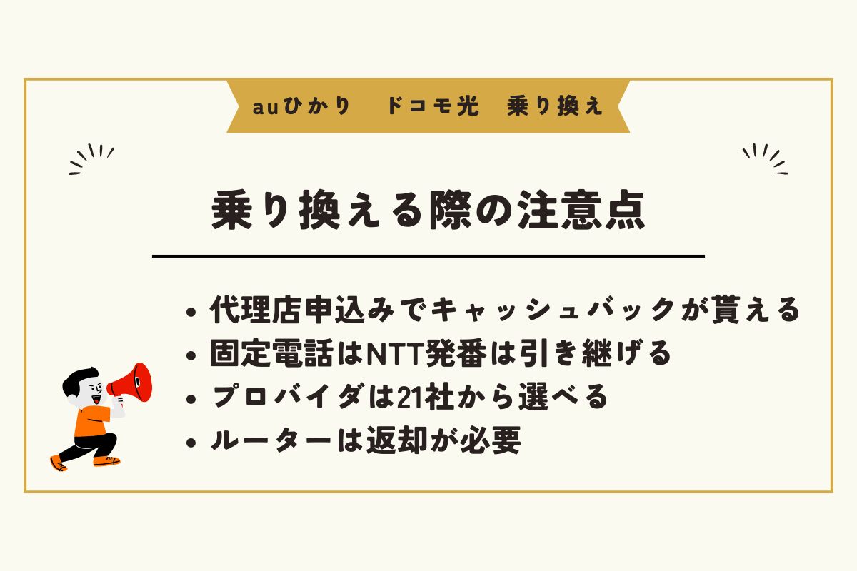 ここでは、auひかりからドコモ光へ乗り換える際の注意点について紹介します。おすすめの申し込み窓口やキャッシュバックについても解説しているので乗り換え前にチェックしておきましょう。