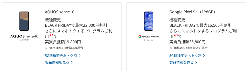 人気アンドロイド端末のAQUOS sense10が実質負担額19,800円、Google Pixel 9aが実質負担額35,800円で購入可能です。