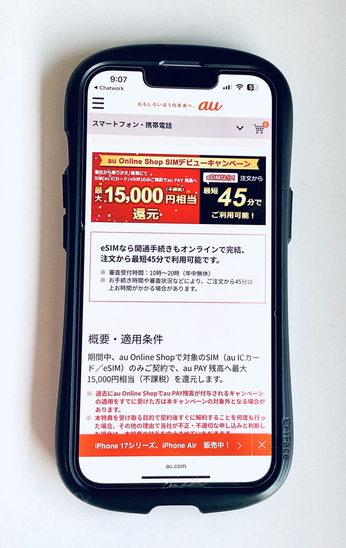 | 特典 | au PAY 残高へ15,000円相当(不課税)を還元 |