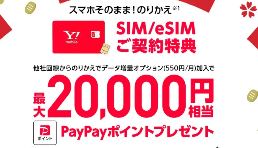 ![]() | SIMカード/eSIMのみ契約でPayPayポイントプレゼント! 他社から乗り換え&データ増量オプション加入で最大20,000円相当のPayPayポイント |