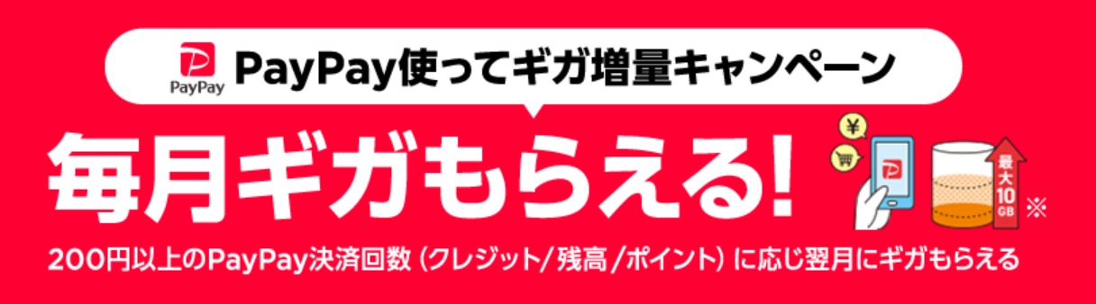 ![]() | PayPay決済でギガがもらえる! 月に最大10GBがもらえるギガ増量キャンペーン開催中 |