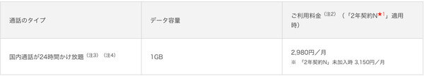 「2年契約N」を適用した基本料金は、1,320円(税抜)です。