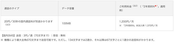音声通話とデータ通信がセットになっており、月間データ容量100MBが利用できます。