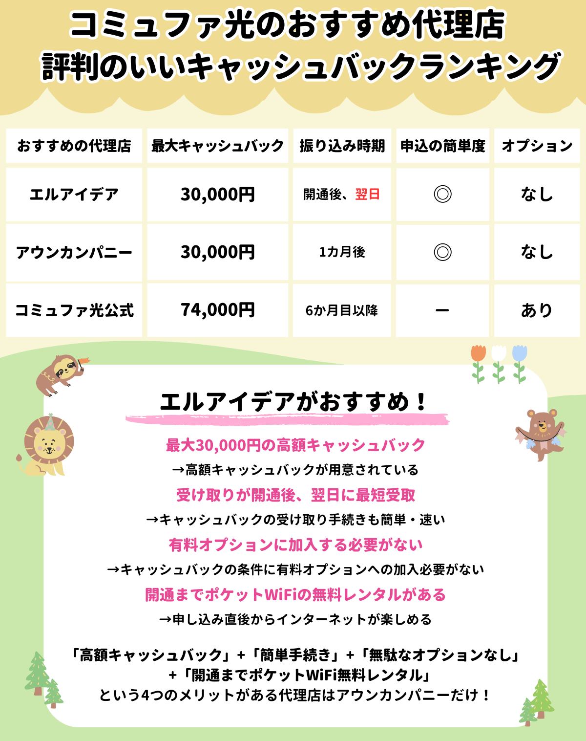 エルアイデアは、キャッシュバックが最大30,000円を開通後、翌日に受け取れますし、オプション契約不要で申し込みも簡単にできる代理店です。そのため、コミュファ光を検討している方はエルアイデアからの申し込みを最もおすすめします。