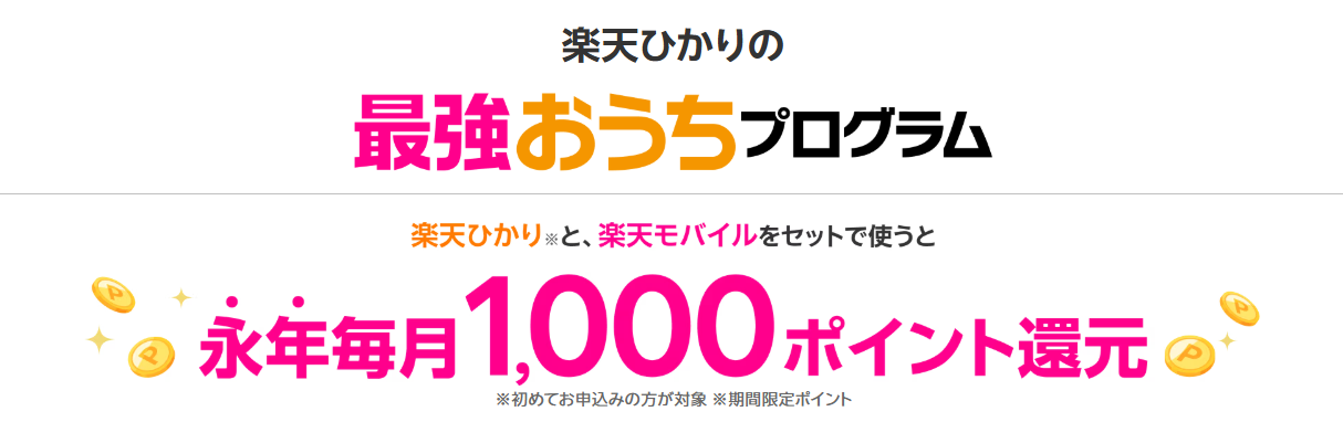 楽天ひかりの今月のキャンペーンは、はじめて楽天ひかりを契約する人が楽天モバイルとセットで契約すると、永年毎月楽天ポイント1,000ポイント還元されます。