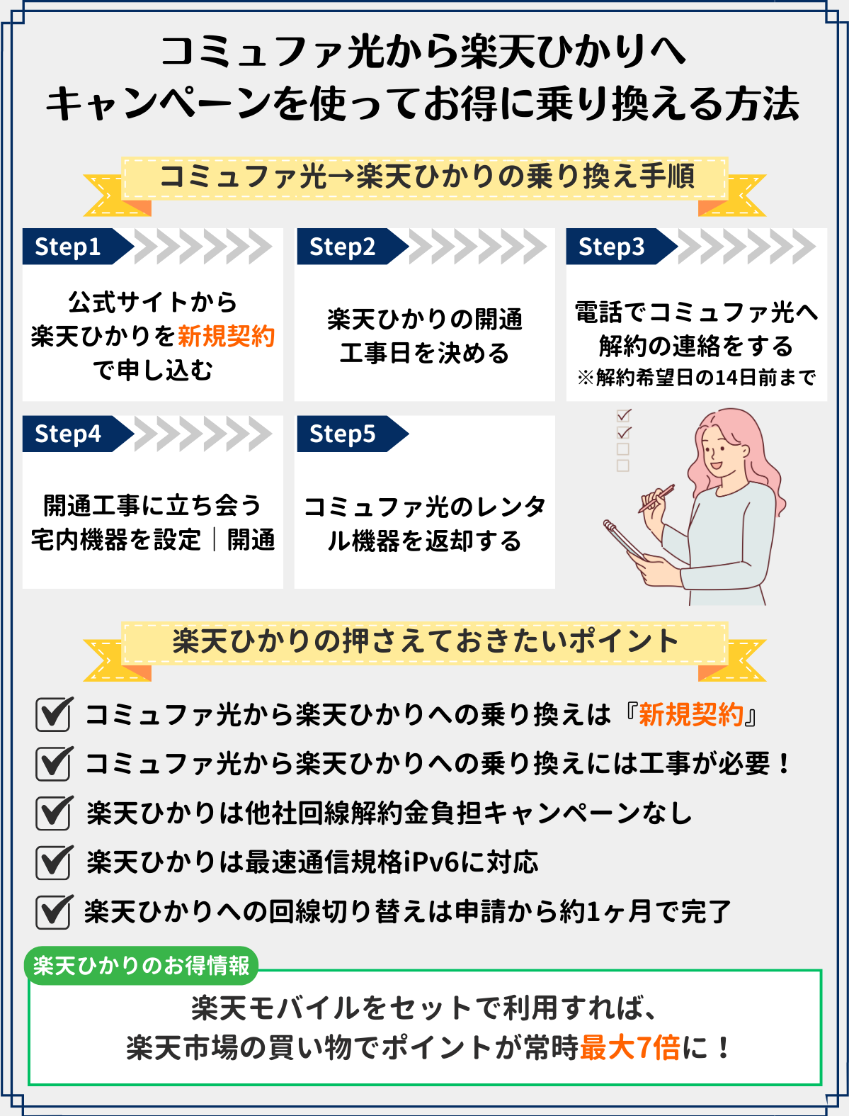 ここでは、コミュファ光から楽天ひかりへ失敗せずに乗り換える手順についてご紹介します。手順を間違えて損をすることがないよう事前にチェックしておきましょう。詳細は以下の通りです。