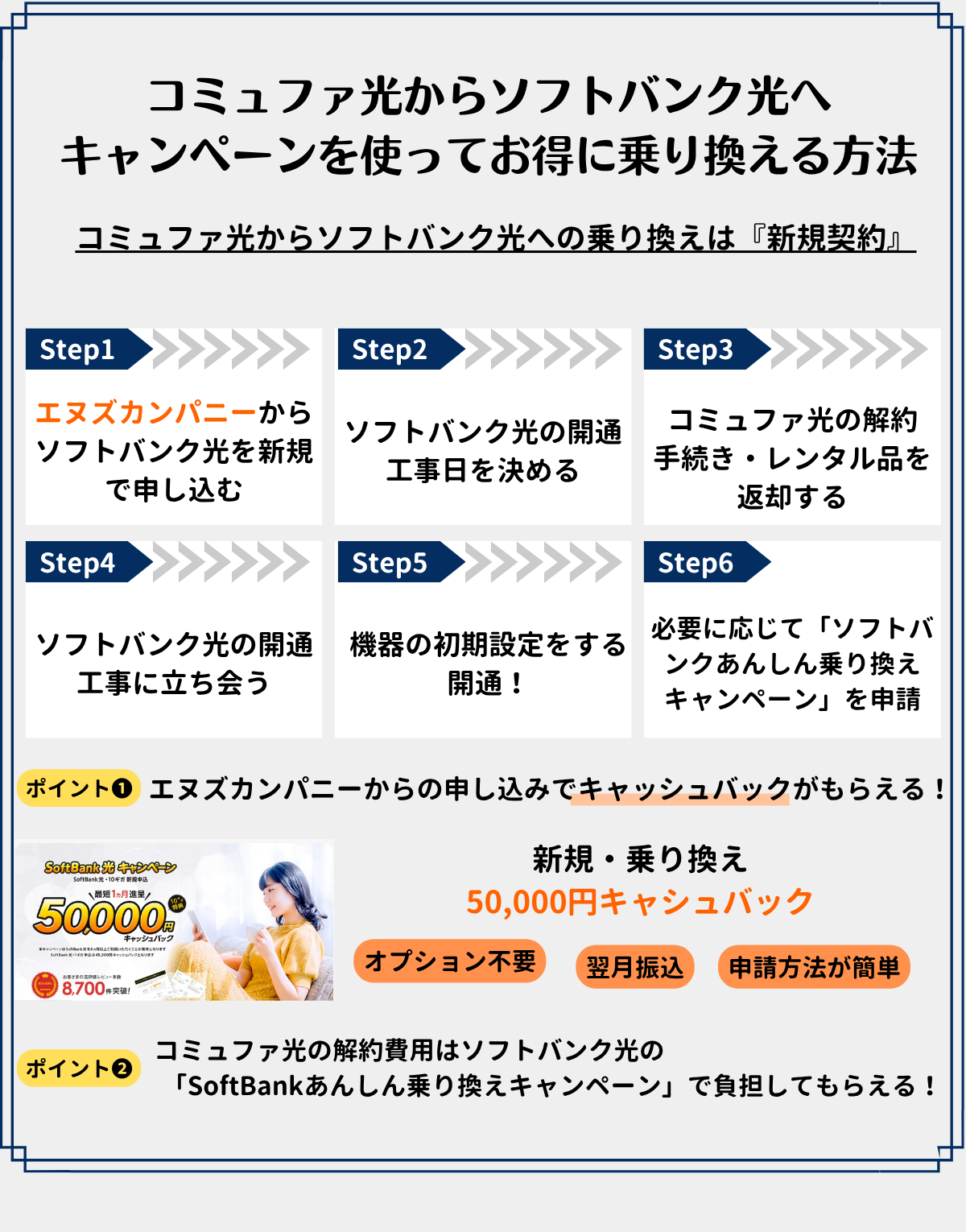 ここでは、コミュファ光からソフトバンク光へキャンペーンを使って乗り換える手順についてご紹介します。手順の詳細は以下の通りです。