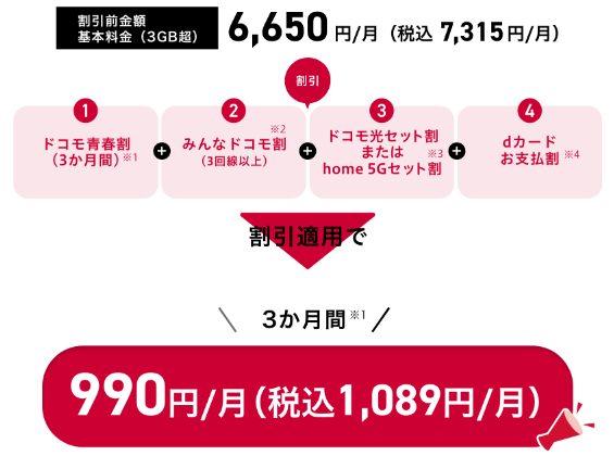 ドコモ青春割の割引とその他割引を併用すると、基本料金7,315円/月が最大3カ月間月々の基本料金1,089円でにてデータ通信が使い放題になります。ドコモ青春割は、基本料金の割引額が3,839円と大きく、毎月の支払いが安くなり嬉しいですね。