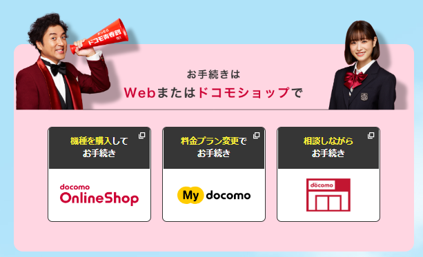 ドコモショップでももちろん受付できます。ドコモショップは予約なしでは受け付けてくれないので、来店予約が必要なので事前にWebにて申込しましょう。当日は来店予約が難しいので、直接ドコモショップ問い合わせるほうが安心です。対面にてプランの詳細や操作方法を聞きたい方は、ショップにてのお手続きが安心ですね。