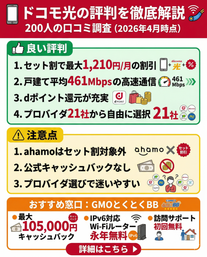 実体験と200人のドコモ光ユーザーから、光回線のおすすめの選び方で重要な「ドコモ光の月額料金」「ドコモ光のキャッシュバック」「ドコモ光のプロバイダ」などのリアルな評判を解説します。