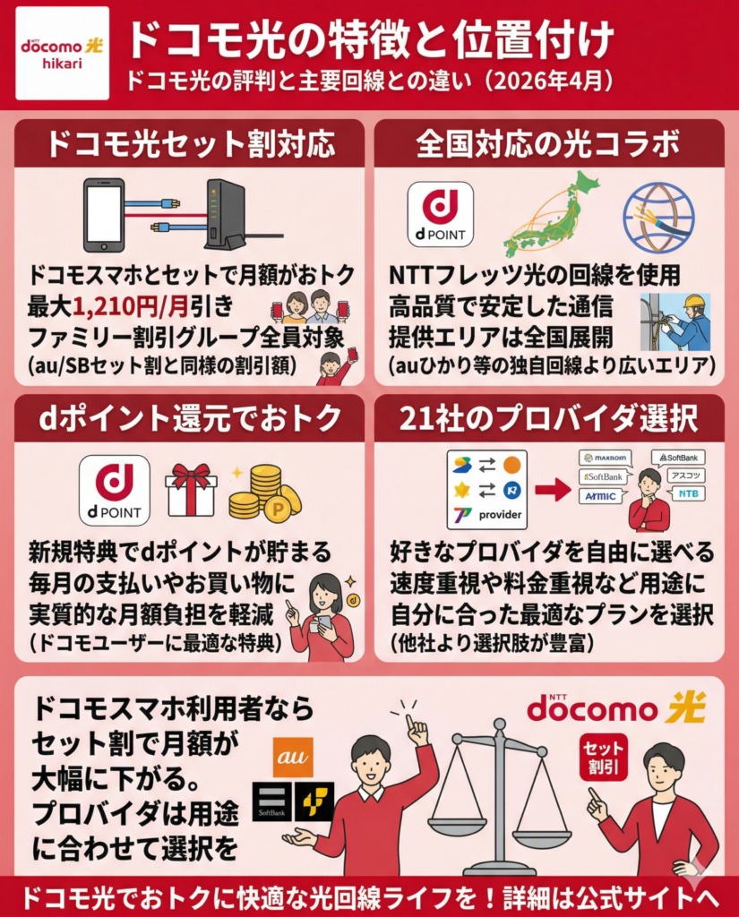 ここでは、ドコモ光と他の光回線の違いについて紹介します。ドコモ光の特徴は以下の通りです。