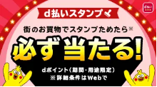 ![]() | d払いでスタンプを貯めると最大10,000ptもらえるチャンス! スタンプカードは10枚までチャレンジ可能 |
