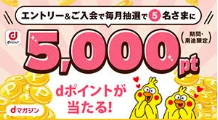 ![]() | 本キャンペーン期間中にエントリー&dマガジン契約で、毎月抽選で5名にdポイント5,000ptをプレゼント! 期間:終了日未定 |