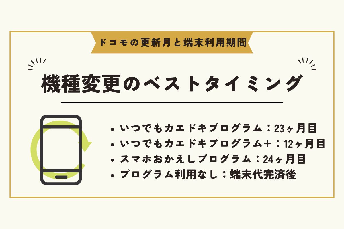 ただし、「いつでもカエドキプログラム」や「いつでもカエドキプログラム+」「スマホおかえしプログラム」を利用してドコモスマホを購入している方は、端末利用期間によって最適な機種変更タイミングが以下のように異なります。