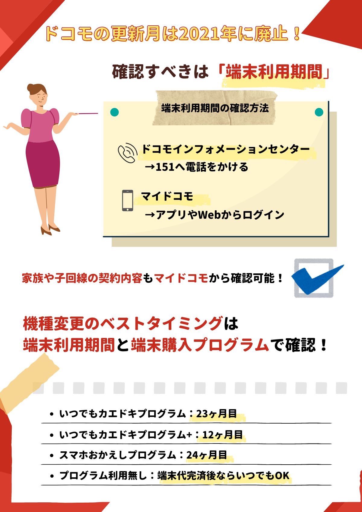 利用している端末購入プログラムによって機種変更をするベストタイミングは異なるので、機種変更を検討している方は、端末利用期間「ドコモインフォメーションセンター」か「マイドコモ」から確認しましょう!