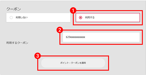 - 「支払い入力」という画面にある「利用するクーポン」を選択