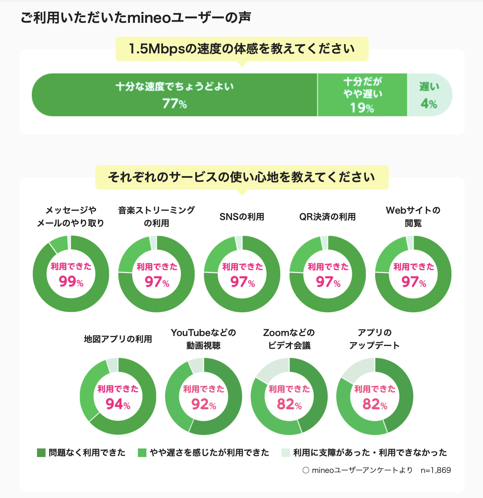 こちらの表を確認すると、ドコモが最も早く、次いでauが早いことがわかります。そのため、より快適にmineoを利用したい場合は、ドコモかau回線を選ぶのがおすすめです。