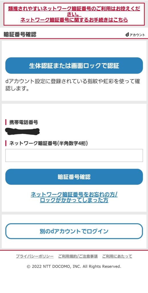 ここではネットワーク暗証番号でログインします。Wi-Fiやテザリングで接続していると、ネットワーク暗証番号が利用できません。必ずモバイル回線(ドコモ回線)を利用してログインするようにしてくださいね。