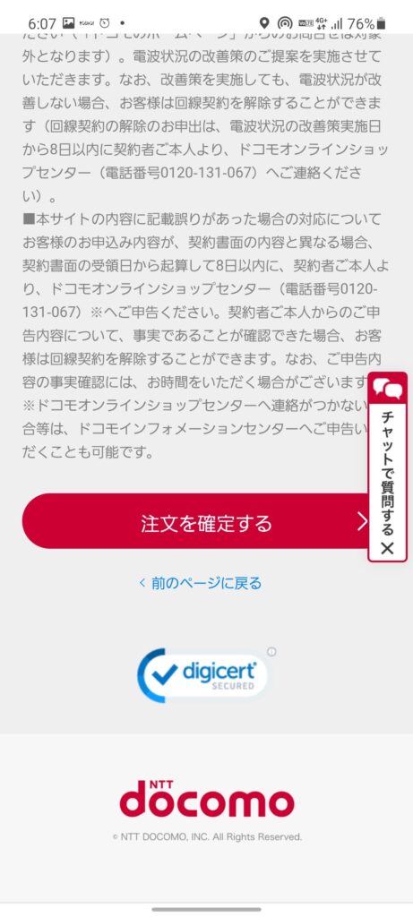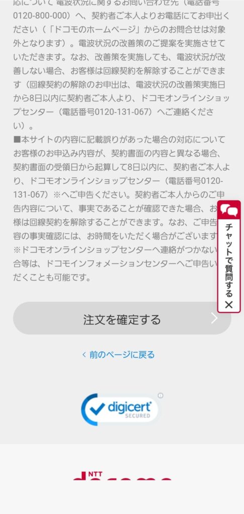 注文内容の確認が終わったら、後は注文を確定するのみ。「注文を確定する」を押せばカンタン手続きでの機種変更手続きが完了です。