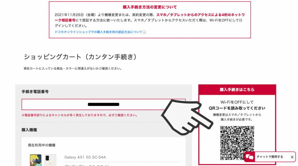 最初にスマホまたはタブレットでQRコードを読み込む点はカンタン手続きも通常手続きも同じです。これ以降の手続きはドコモのセキュリティ設定の関係上、パソコンでの手続きはできません。