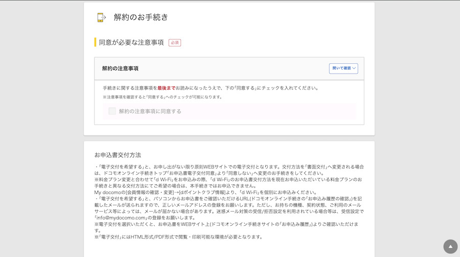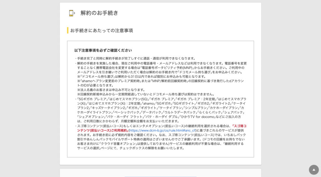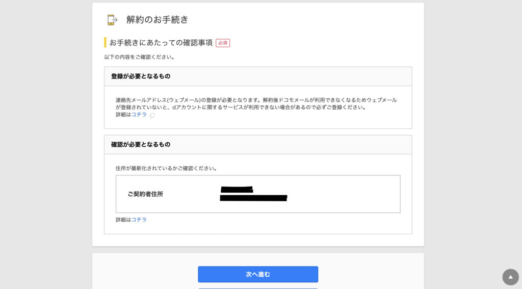 注意事項の確認ができたら、ページ下部の「同意した上で解約の手続きに進む」を押してください。