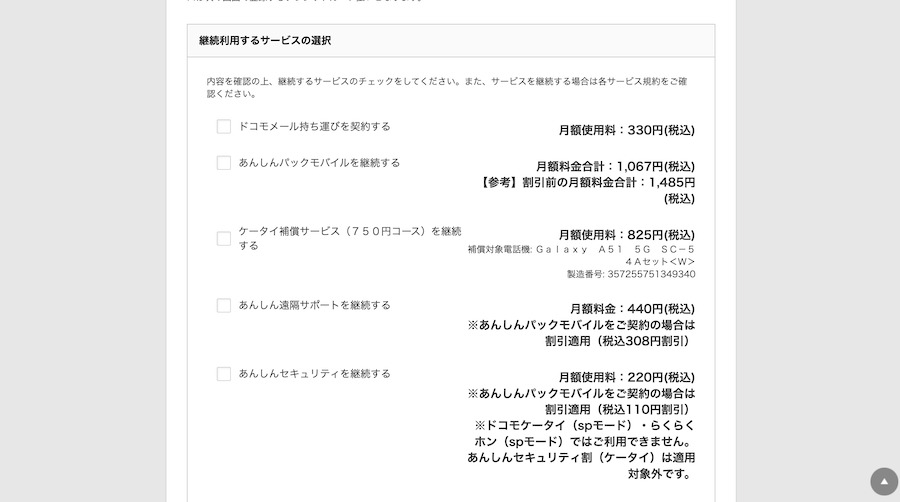 ドコモのスマホを解約したとしても、ドコモのサービスのすべてを解約する必要はありません。スマホの解約後も継続したいサービスがあれば、「継続利用するサービスの選択」画面で選択できます