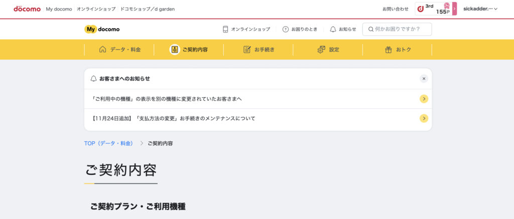My Docomoにアクセスして、ページ上部の「ご契約内容」という項目を選択すると、料金プランが確認できます。また、このページから料金プランの変更も行うことも可能です。