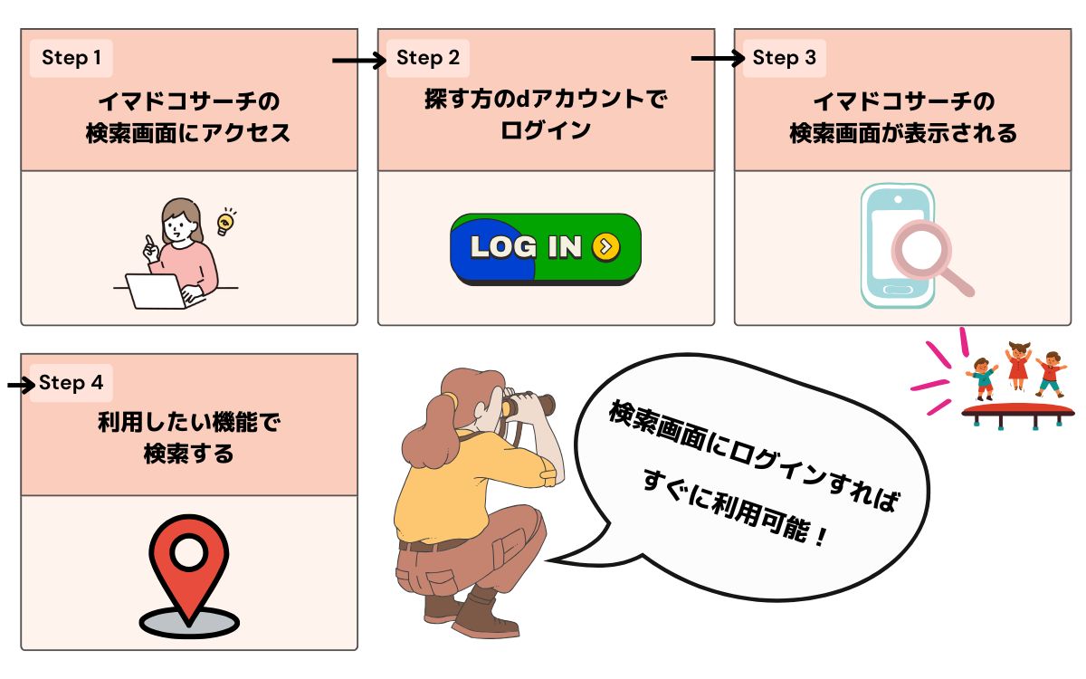 - 探す側が「イマドコサーチ検索ページ」にアクセスする