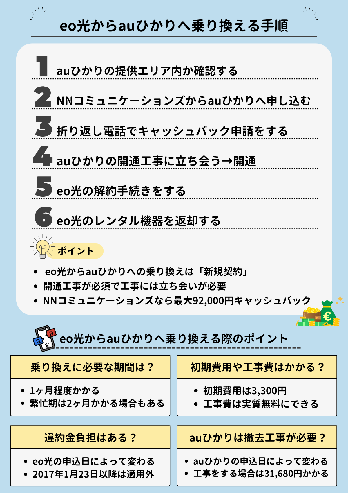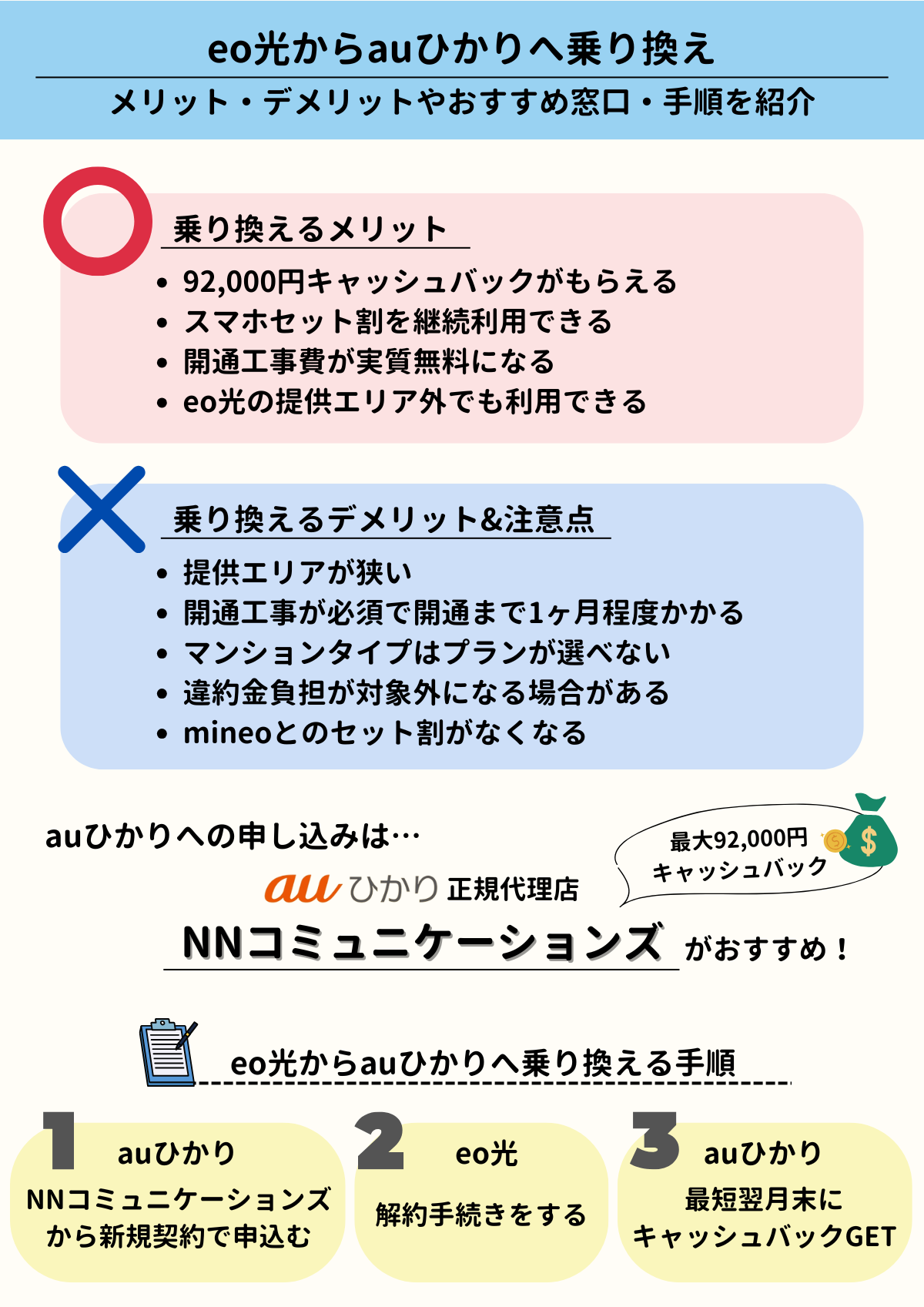 ただし、eo光を契約更新期間に解約すれば違約金は0円にできます。また、NNコミュニケーションズからauひかりに申し込めば最大92,000円が受け取れるので、キャッシュバックを違約金に充てることもできます。