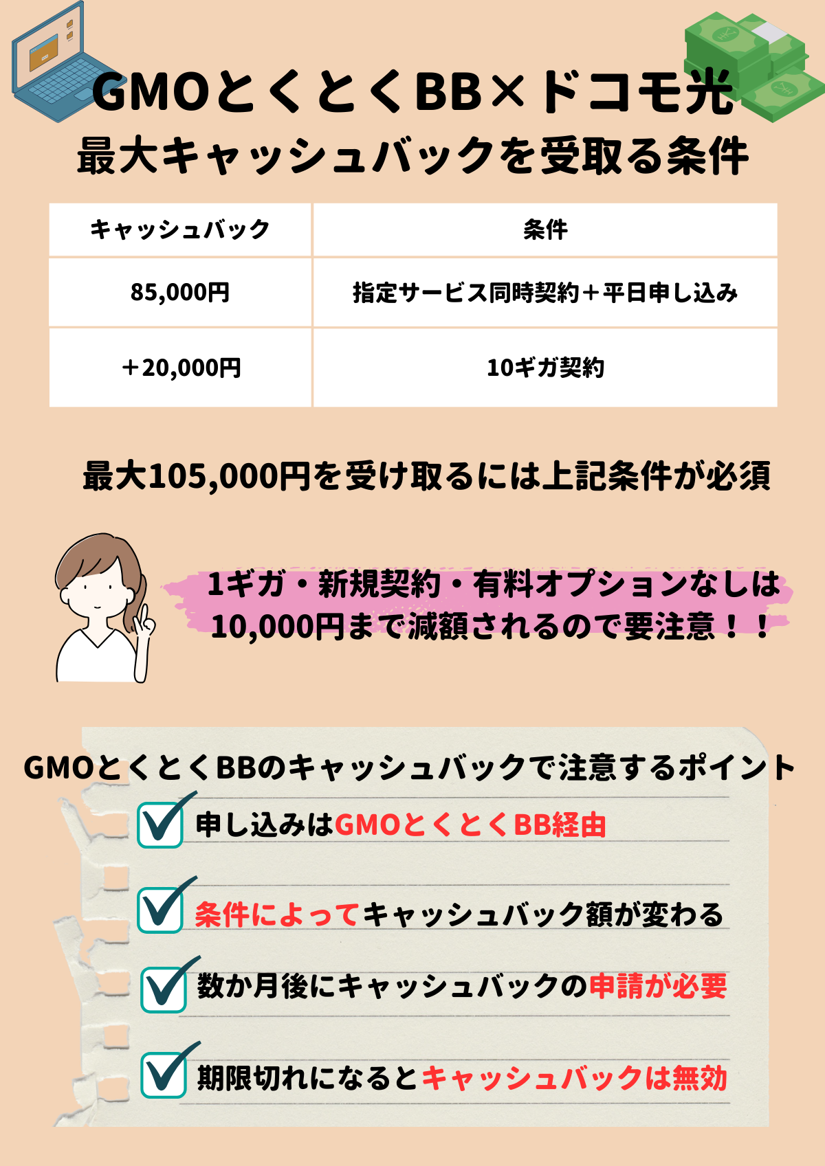 GMOとくとくBB×ドコモ光のキャッシュバックは、最大金額こそ105,000円と高額ですが、最高額を受け取るためには乗り換えで10ギガ契約、有料オプション加入が必要です。