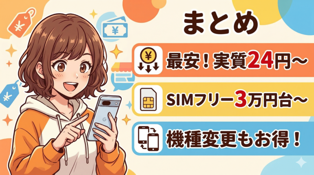 結論から言うと、MNP(乗り換え)+端末返却プログラムを組み合わせれば、Pixel 10aを実質24円から利用できます。返却なしでも楽天モバイルなら実質13,760円と、非常にお得に購入可能です。