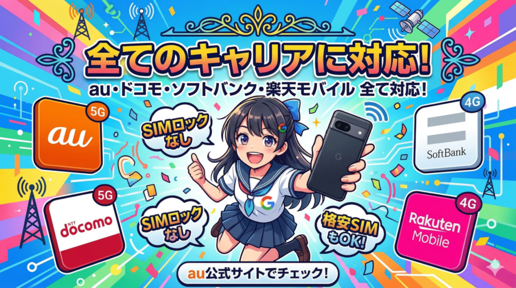 Google Pixel 10aは、au・ドコモ・ソフトバンク・楽天モバイルのすべてのキャリアに対応しています。5G・4G LTEの両方に対応しているため、どのキャリアでも快適に利用可能です。