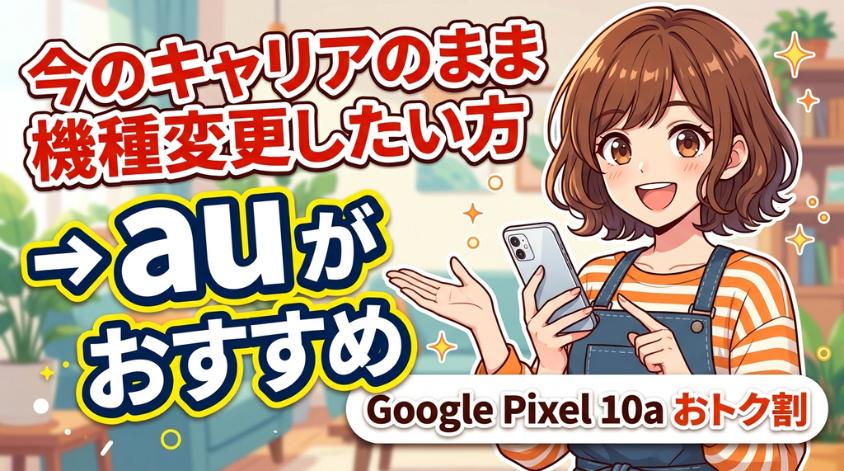 キャリアを変えたくない方には、auの「Google Pixel 10a機種変更おトク割」が魅力的です。最大22,000円の割引が受けられ、128GBモデルが67,800円になります。