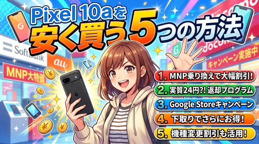Pixel 10aをお得に購入する方法は大きく5つあります。MNP乗り換えで最大43,527円の割引を受ける方法や、端末返却プログラムで実質24円から利用する方法など、購入スタイルに合った節約術を具体的な金額とともに解説していきますね。