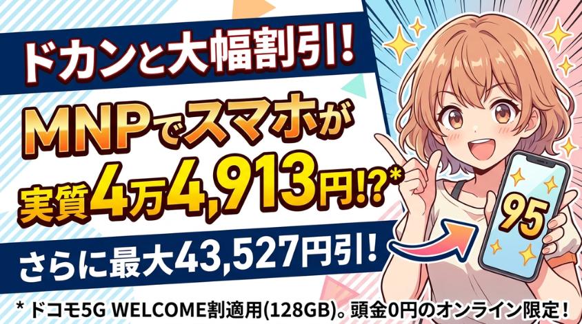 最も大きな割引が受けられるのが、他社からのMNP(乗り換え)です。各キャリアはMNPユーザーに対して大幅な割引を用意しており、最大で43,527円もの割引が適用されます。