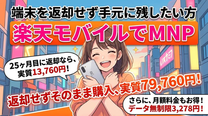 「2年後に返却するのは嫌だ」「端末を手元に残しておきたい」という方には、楽天モバイルのMNPがおすすめです。
