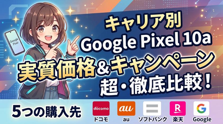 この記事では、Google Pixel 10aを最安で購入する方法を、au・ドコモ・ソフトバンク・楽天モバイル・Google Storeの5つの購入先で徹底比較しています。キャリアごとの本体価格・キャンペーン情報・実質負担額をわかりやすくまとめました。