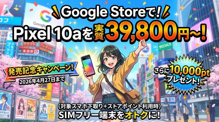 Google Storeでは、Pixel 10aの発売を記念したキャンペーンを2026年4月27日まで実施しています。