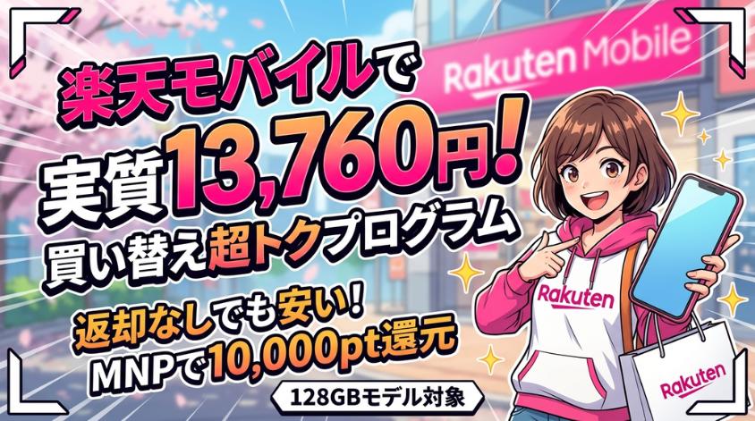 最大の特徴は「返却なし」でも安く購入できることです。MNPで「Rakuten最強プラン」に初めて申し込むと10,000ポイント還元。「買い替え超トクプログラム」(楽天カード48回払い)を利用して25ヶ月目に返却すれば、実質13,760円になります。