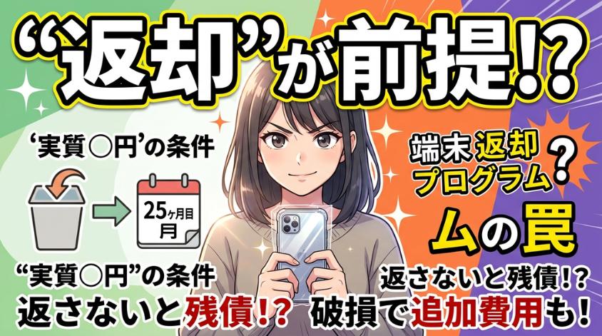 ソフトバンクやドコモ、auの「実質○円」という価格は、25ヶ月目前後に端末を返却することが条件です。返却しなければ残債の支払いが必要になり、結果的に本体価格をそのまま支払うことになります。