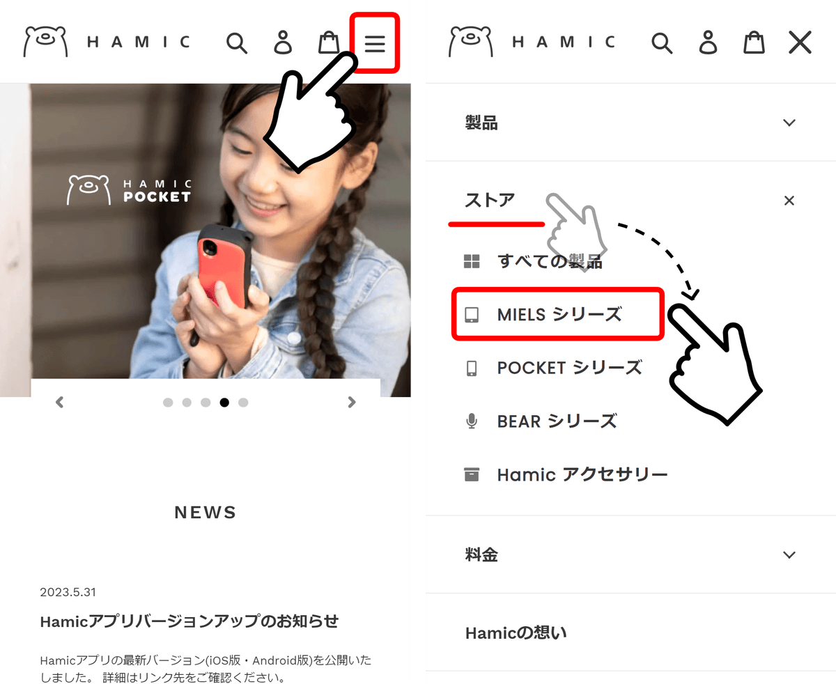 はみっく公式サイトのメニューを開き、『ストア』の中から『MIELSシリーズ』を表示します。 - はみっくミエルスを選択