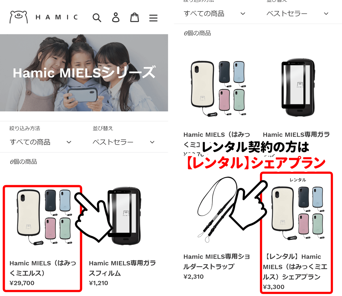 商品一覧の中から『はみっくミエルス』を選択します。このとき、レンタル契約をしたい場合には『【レンタル】はみっくミエルスシェアプラン』を選択してください。ここでレンタルの方を選ばないと端末購入の手続きになってしまうので注意してくださいね。 - はみっくミエルスをカートに追加する