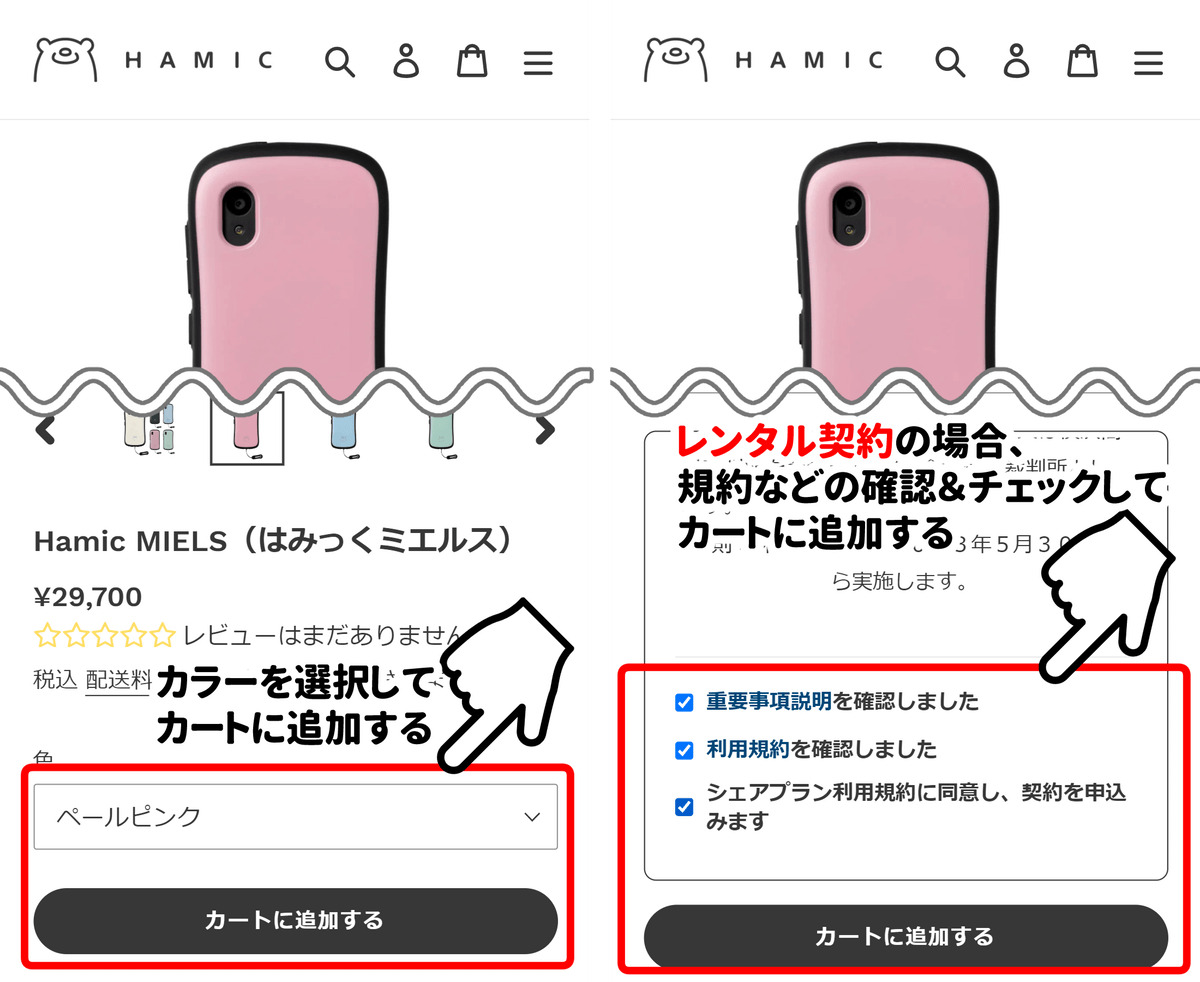 はみっくミエルスの詳細ページから購入したい色を選択して『カートに追加する』を選択します。レンタル契約の場合はここでレンタル契約に関する注意事項に同意しなければいけません。カートに追加するボタンの上に注意事項が記載されているので、最後まで読んでから3つのチェックボックスにチェックを入れてくださいね。カートに追加できたら支払いに進むので、そのほかに購入したいアイテムがある場合は引き続き買い物を続けて購入したいアイテムをすべてカートに追加してください。 - ショッピングカートを確認する